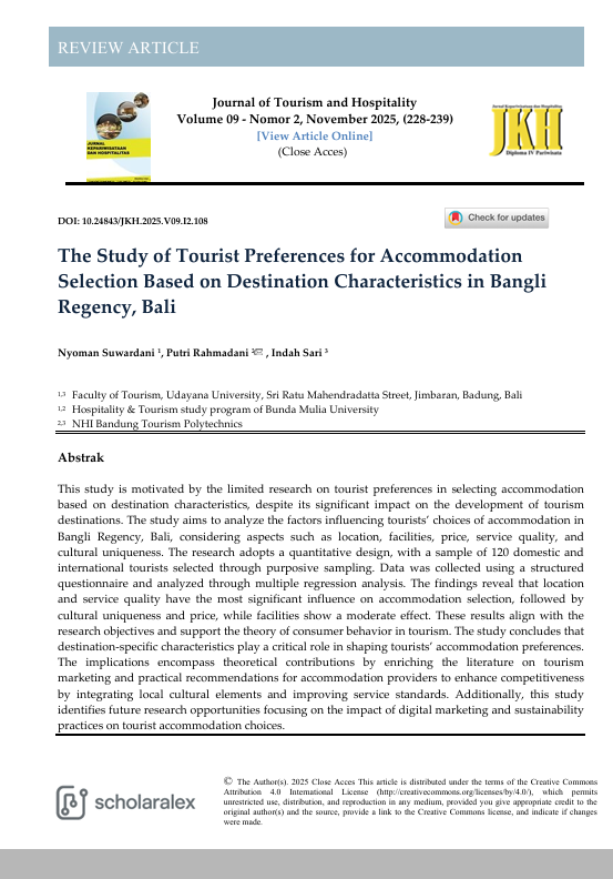 This study is motivated by the limited research on tourist preferences in selecting accommodation based on destination characteristics, despite its significant impact on the development of tourism destinations. The study aims to analyze the factors influencing tourists’ choices of accommodation in Bangli Regency, Bali, considering aspects such as location, facilities, price, service quality, and cultural uniqueness. The research adopts a quantitative design, with a sample of 120 domestic and international tourists selected through purposive sampling. Data was collected using a structured questionnaire and analyzed through multiple regression analysis. The findings reveal that location and service quality have the most significant influence on accommodation selection, followed by cultural uniqueness and price, while facilities show a moderate effect. These results align with the research objectives and support the theory of consumer behavior in tourism. The study concludes that destination-specific characteristics play a critical role in shaping tourists’ accommodation preferences. The implications encompass theoretical contributions by enriching the literature on tourism marketing and practical recommendations for accommodation providers to enhance competitiveness by integrating local cultural elements and improving service standards. Additionally, this study identifies future research opportunities focusing on the impact of digital marketing and sustainability practices on tourist accommodation choices.