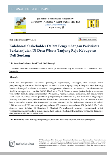This study analyzes stakeholder collaboration, challenges, and strategies for sustainable tourism development in Tanjung Rejo Tourism Village, Deli Serdang Regency. A qualitative descriptive method was applied, using observation, interviews, and documentation. The analysis employed SWOT, along with IFAS and EFAS matrices. The findings show cooperation among the village government, community groups (Pokdarwis, Karang Taruna), academics, and the Village-Owned Enterprises (BUMDes) in training, infrastructure development, and environmental conservation. However, community participation is low, private sector involvement is limited, and infrastructure remains inadequate. IFAS analysis scored strengths at 1.86 and weaknesses at 0.62 (difference 1.24), while EFAS scored opportunities at 1.72 and threats at 0.70 (difference 1.02). The village’s strategic position lies in Quadrant I (Growth Strategy), with recommendations for active development through enhancing attractions, improving infrastructure, strengthening branding, and fostering external partnerships.