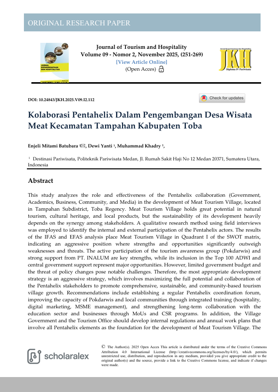 This study analyzes the role and effectiveness of the Pentahelix collaboration (Government, Academics, Business, Community, and Media) in the development of Meat Tourism Village, located in Tampahan Subdistrict, Toba Regency. Meat Tourism Village holds great potential in natural tourism, cultural heritage, and local products, but the sustainability of its development heavily depends on the synergy among stakeholders. A qualitative research method using field interviews was employed to identify the internal and external participation of the Pentahelix actors. The results of the IFAS and EFAS analysis place Meat Tourism Village in Quadrant I of the SWOT matrix, indicating an aggressive position where strengths and opportunities significantly outweigh weaknesses and threats. The active participation of the tourism awareness group (Pokdarwis) and strong support from PT. INALUM are key strengths, while its inclusion in the Top 100 ADWI and central government support represent major opportunities. However, limited government budget and the threat of policy changes pose notable challenges. Therefore, the most appropriate development strategy is an aggressive strategy, which involves maximizing the full potential and collaboration of the Pentahelix stakeholders to promote comprehensive, sustainable, and community-based tourism village growth. Recommendations include establishing a regular Pentahelix coordination forum, improving the capacity of Pokdarwis and local communities through integrated training (hospitality, digital marketing, MSME management), and strengthening long-term collaboration with the education sector and businesses through MoUs and CSR programs. In addition, the Village Government and the Tourism Office should develop internal regulations and annual work plans that involve all Pentahelix elements as the foundation for the development of Meat Tourism Village. The implementation of this aggressive strategy will optimize the recognition from ADWI, the potential of MSMEs, and the trend of ecotourism to strengthen the position of Meat Tourism Village as a leading and sustainable tourist destination.